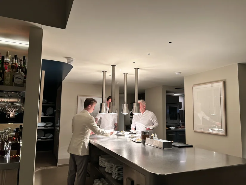 Bij Azurite ga je niet simpelweg aan tafel om daar enkele uren statisch door te brengen. Ridder vindt dat ‘saai’ en zorgt voor een afwisselend programma op meerdere plekken in zijn zaak, zonder dat het overdreven of gekunsteld voelt. Zo start je je reis aan de bar, met champagne en bites, en beleef je een actieve avond op diverse plekken in het restaurant. We verklappen bewust niet alles, behalve dat je in ieder geval ook de unieke wijnzolder van dichtbij te zien krijgt. Alles wat er op je wijnbucktlist staat, hoe onhaalbaar of onbetaalbaar ook, het ligt daar. Kwijlen.