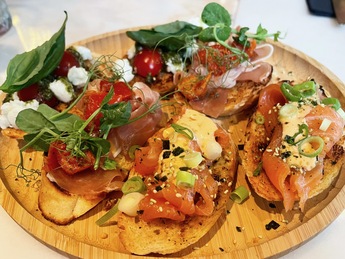 Daarna reizen we door naar Spanje met een plateau van drie verschillende pintxos. De keuze voor de caprese met pesto en de parmaham met zongedroogde tomaat vinden we wat veilig. De uitblinker is dan ook de zalm met srirachasaus, sesamzaad en zeewiersnippers.