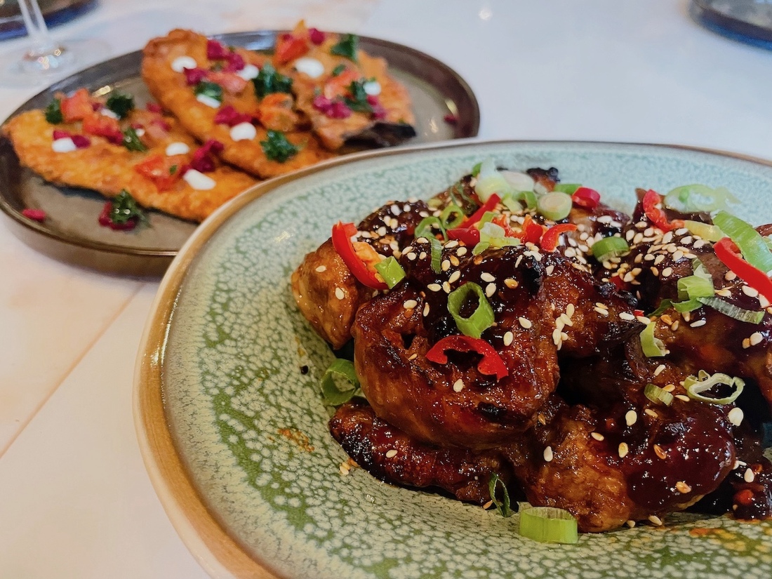 Onze gastvrouw van de avond raadt aan om twee tot drie gerechtjes per persoon van de kaart te bestellen, die onderverdeeld is in vis, vlees en vega. We besluiten om onze wereldreis feestelijk af te trappen met de Haute de Friture en de Thaise oesters met zwarte bonen.