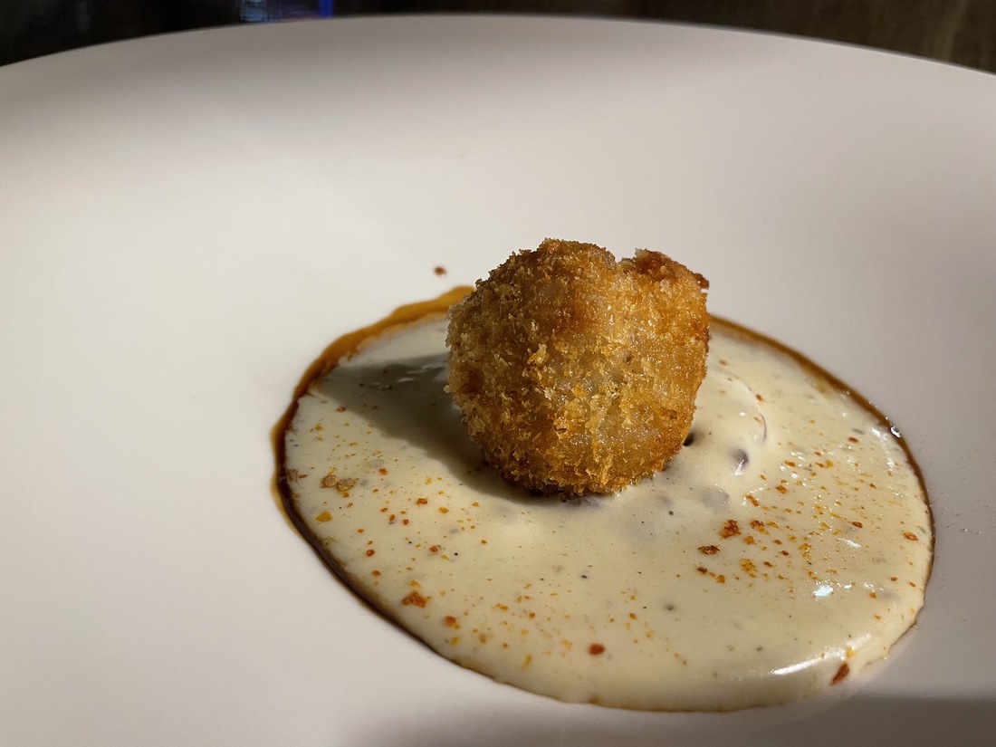 De zilte plantjes, de appelgelatine, gefermenteerde knoflook, gerookte mayonaise en het zolderspek zijn accenten. Het fundament waarop het gerecht staat, is een fascinerende, rokerige dashi-bouillon.
