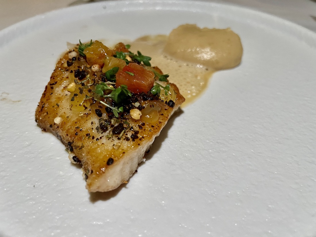 Bij de volgende culinaire zet weer die sensatie. De rogvleugel is eenvoudig qua presentatie met twee opvallende componenten. De naar beurre noisette smakende bloemkoolcrème en een romige saus op basis van tarbotgraten. Waar normaal de focus valt op de rog, ervaar je hier dat Thales en Jelmer hun “zaligheid” tonen in de sauzen. In culi-taal wordt zoiets wel signatuur genoemd. Vaak een hol woord, maar hier is het goed aanwijsbaar.