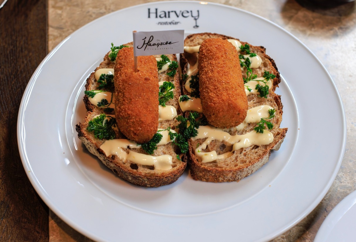 Neem ook een typisch lunchgerecht: Chef Morris serveert hier een klassieker met Haagse signatuur. Op zuurdesembrood van bakker Bro liggen twee royale garnalenkroketten van De Haagsche Croquetterij. De kroketten zijn gevuld met een romige salpicon van Noordzeegarnalen, geflankeerd door krokant gebakken peterselie en afgewerkt met een speels zigzagje limoenmayonaise voor een frisse nuance. De kwaliteit van de kroketten staat buiten kijf.