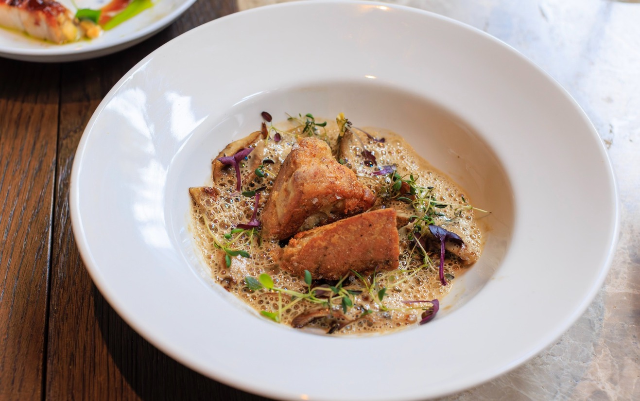 Morris vertelt dat de combinatie van buikspek en miso hem aansprak maar naar zijn smaak ook té uitgesproken Aziatisch. Hij breidde het uit met restproducten van aardappel, een praktische vondst, en verwerkte zijn voorliefde voor dashi in een luchtige saus.