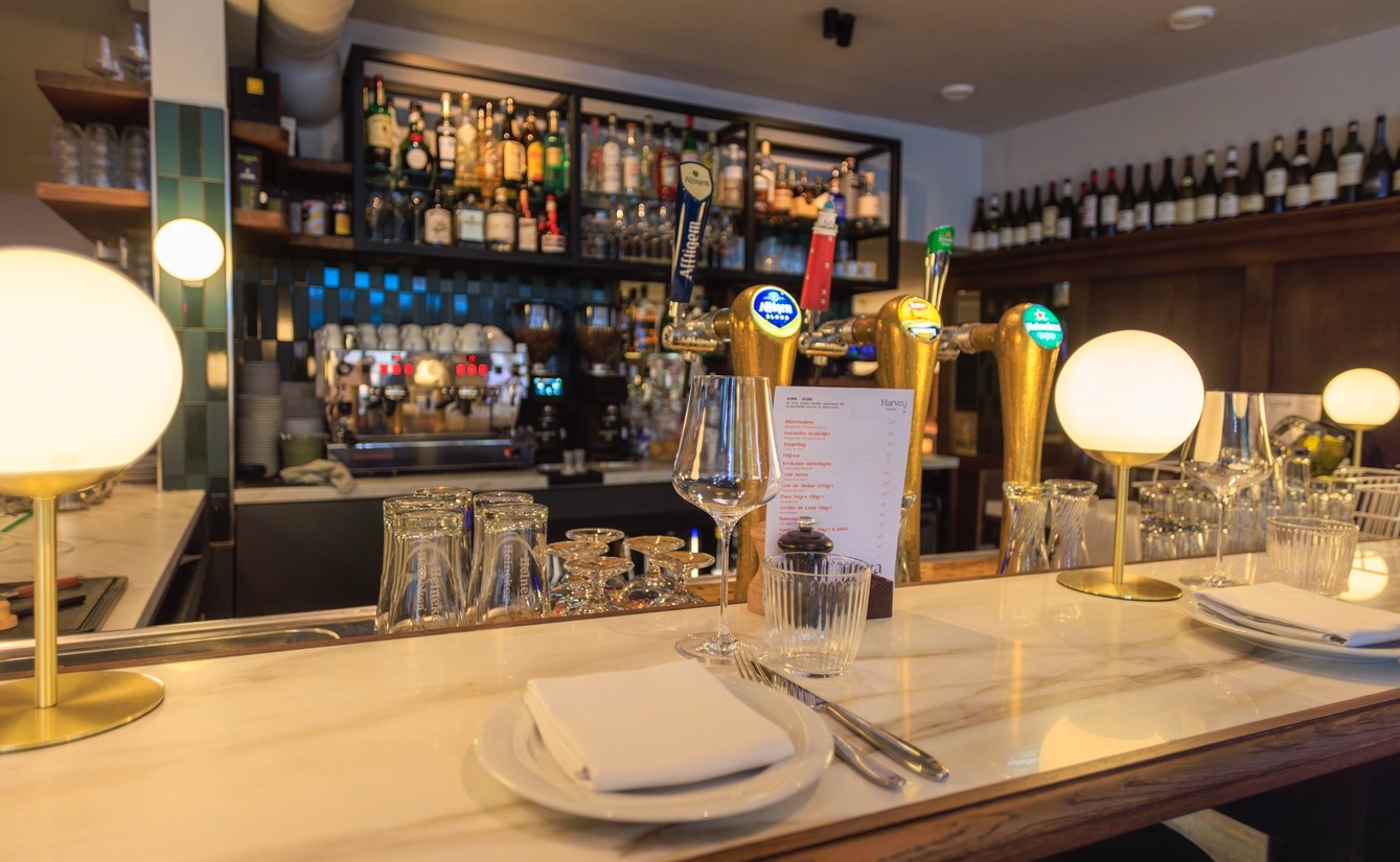 Eline vertelt dat Harvey vooral warm en gezellig moest worden. Een restobar waar je ’s ochtends koffie drinkt, luncht, borrelt en tot laat dineert. Het interieur werd volledig vernieuwd, met dank aan designbureau Smeele.