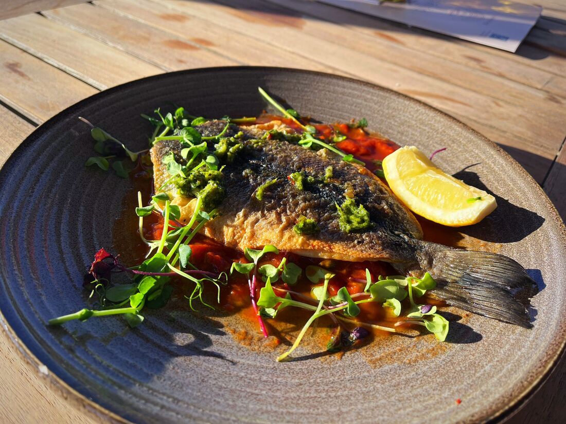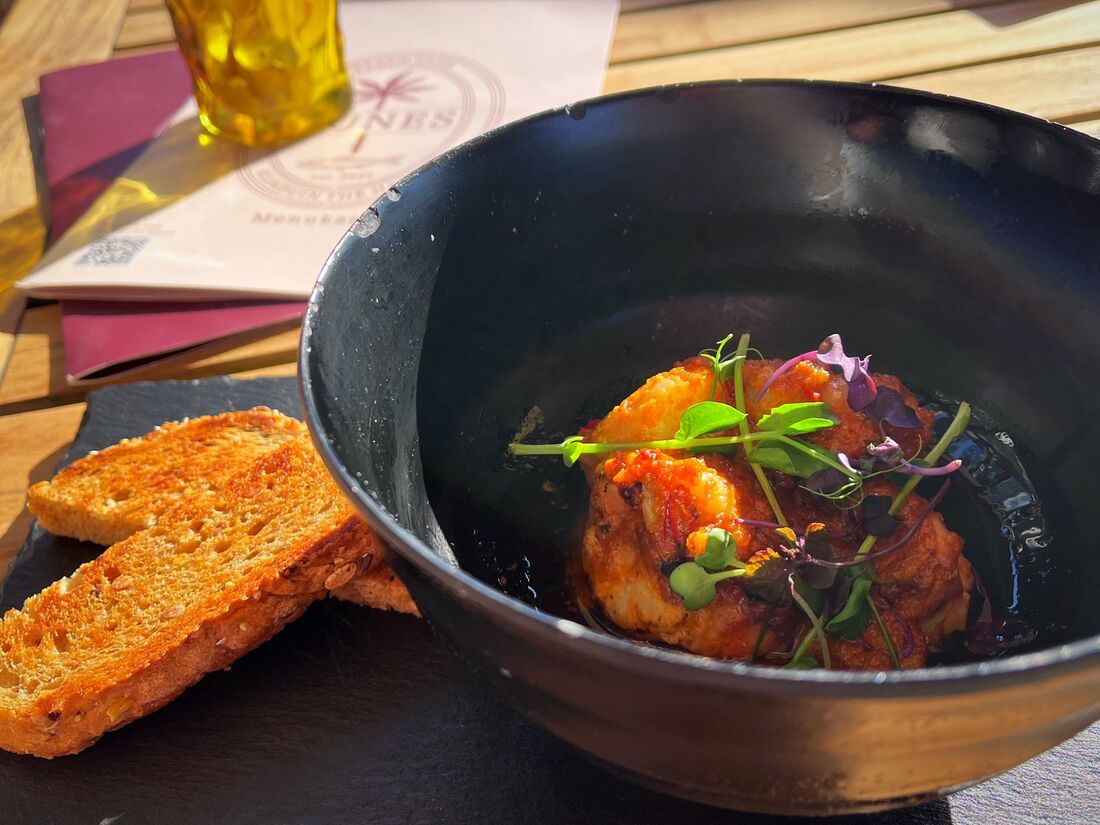 De romige burrata in combinatie met de frisse tomaten is perfect voor een warme zomerdag aan zee. Daarnaast gaan we voor de gambas al ajillo, geserveerd in een saus van rode peper, boter en limoen, met getoast brood om in te dippen. De gamba's zijn royaal van formaat en perfect gebakken.