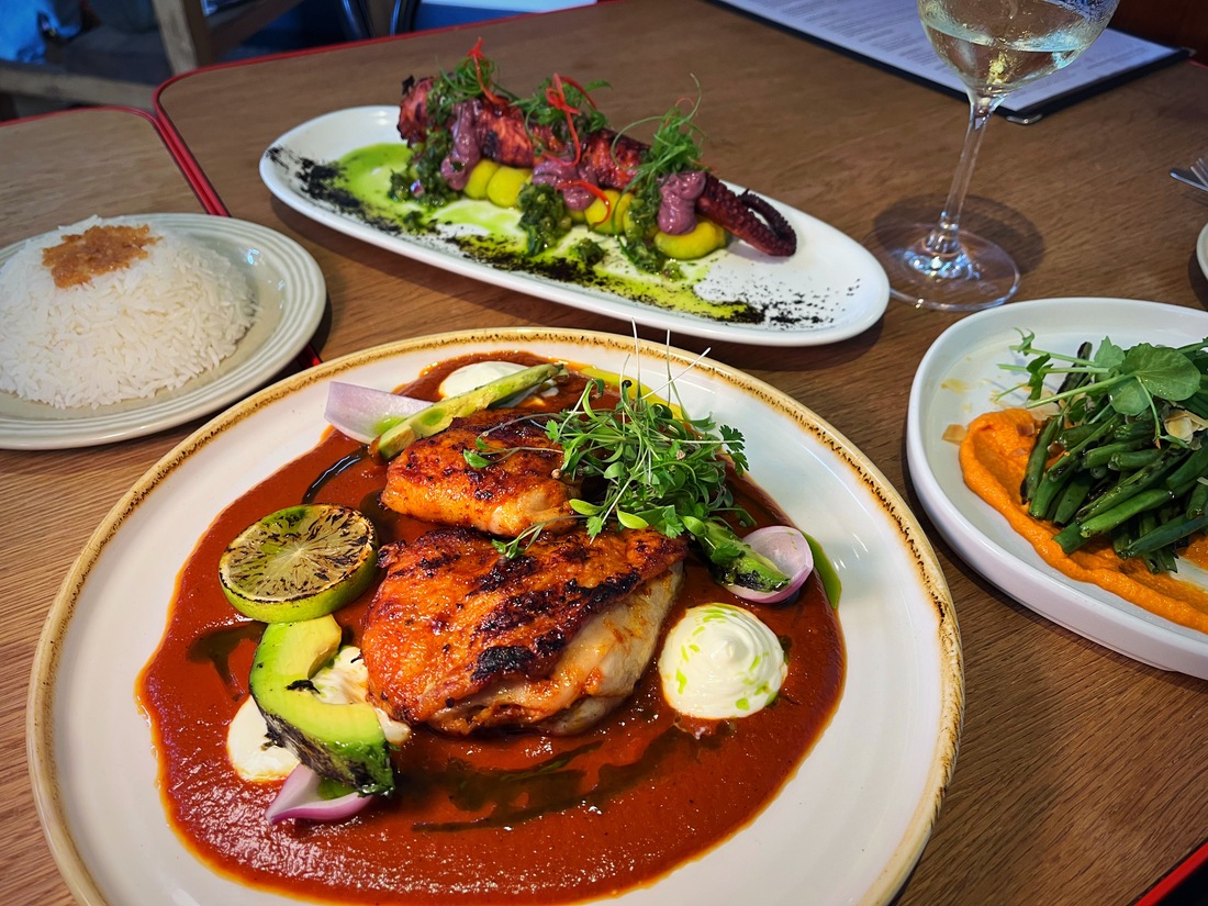 Onze keuze valt op de Salmuera kip en de gegrilde pulpo. De kip is gemarineerd in een rijke anticuchera marinade (mengsel van chilipasta, knoflook, komijn, oregano, azijn en olie) en geserveerd met een langzaam gegaarde tomatensaus, gebrande avocado en een luchtige feta crème.