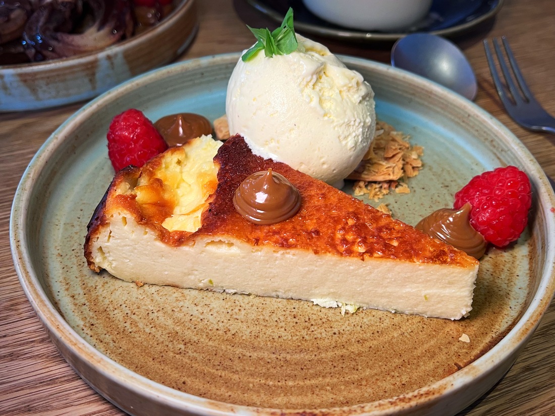 Buiten de kaart om hebben ze ook een cheesecake. Gemaakt met amandellikeur en geserveerd met dulce de leche, vanilleijs en framboos. De cheesecake is zacht en vol van smaak met een mooie hint van amandellikeur.
