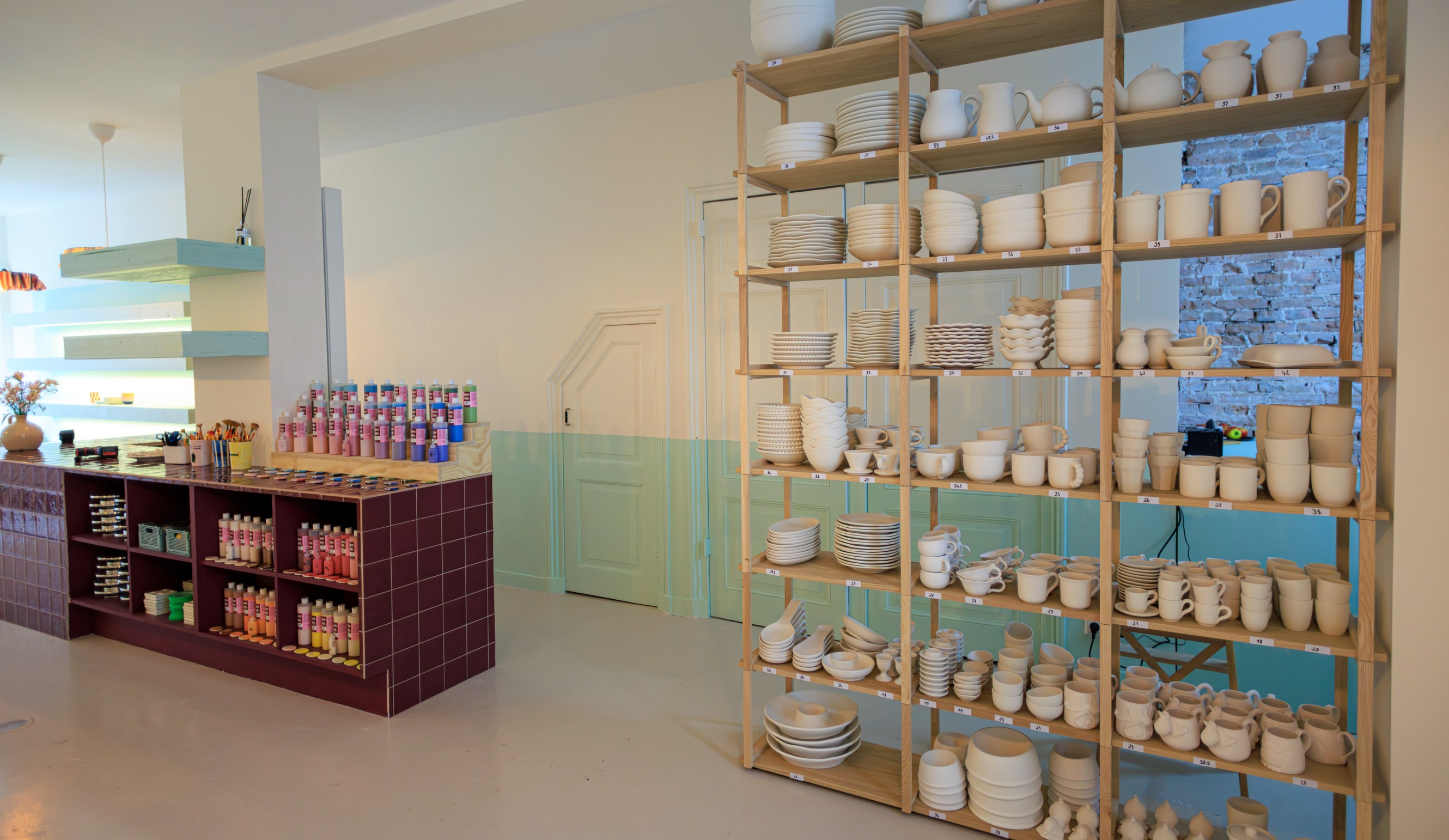 Bij het keramiekcafé Palette aan de Elandstraat schilder je een bestaand keramiek werkje, zoals een mok of kom, onder het genot van een lekker drankje.