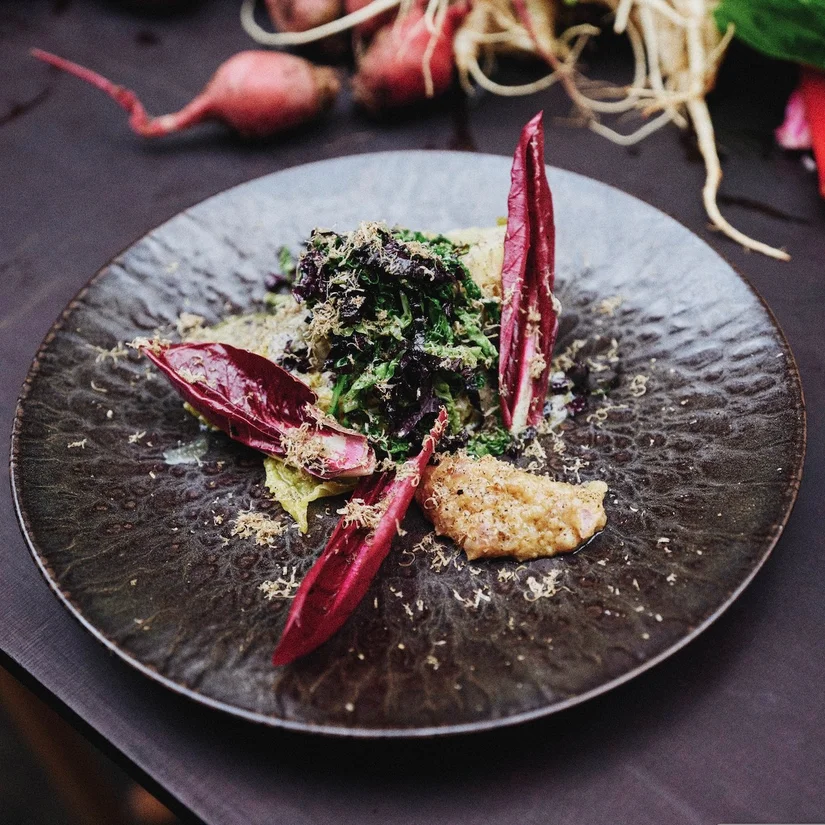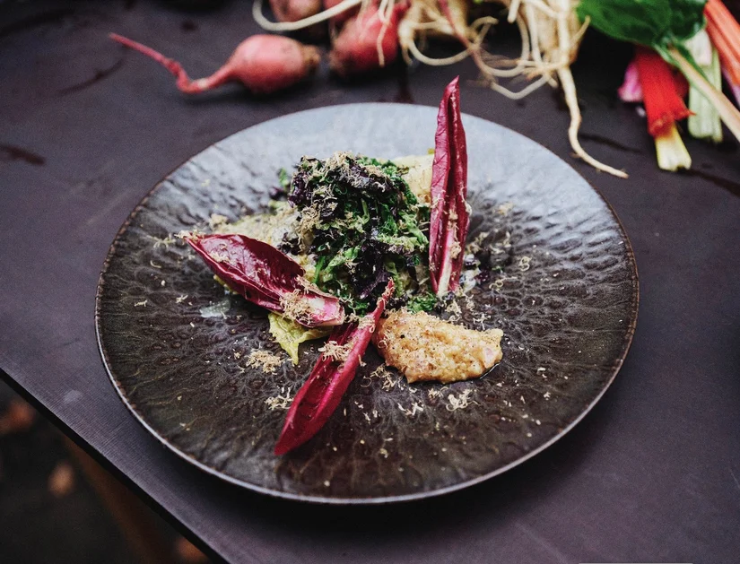 Voor carnivoren is het wennen dat De Vuurplaats relatief veel groenten gebruikt. "Ons voorgerecht is altijd vegetarisch. Meestal prei. In deze periode gebruik ik vaak koolrabi of spruitjes, met yoghurt, zwarte knoflook en gepickelde appel. Tot december is er ook Treviso sla met in as gegaarde pompoen en salsa van barbarakruid, dille, ui en dukkah. Voor onze bloemkool, die we op dezelfde manier bereiden als picanha, krijgen we zelfs complimenten van de grootste vleeseters."
