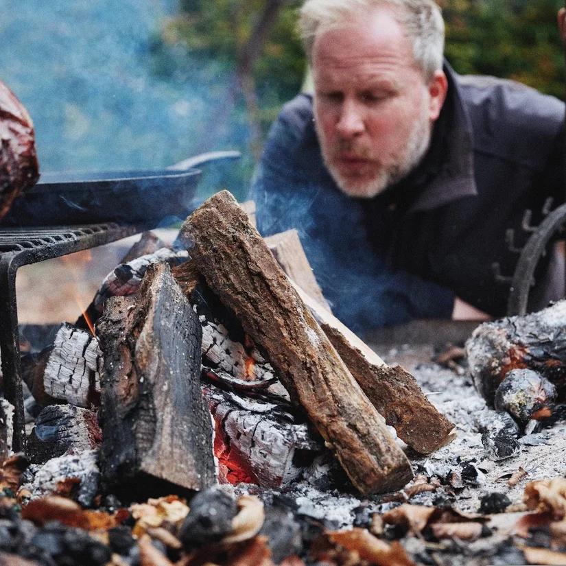 "Je moet aan de lucht gedroogd hout hebben, niet ovengedroogd." Dan wordt het vuur te heet en krijgt alles een overheersende rooksmaak. Ook het soort hout is belangrijk. Berken is perfect aanmaakhout. Eiken en beuken zijn het best om mee te werken."