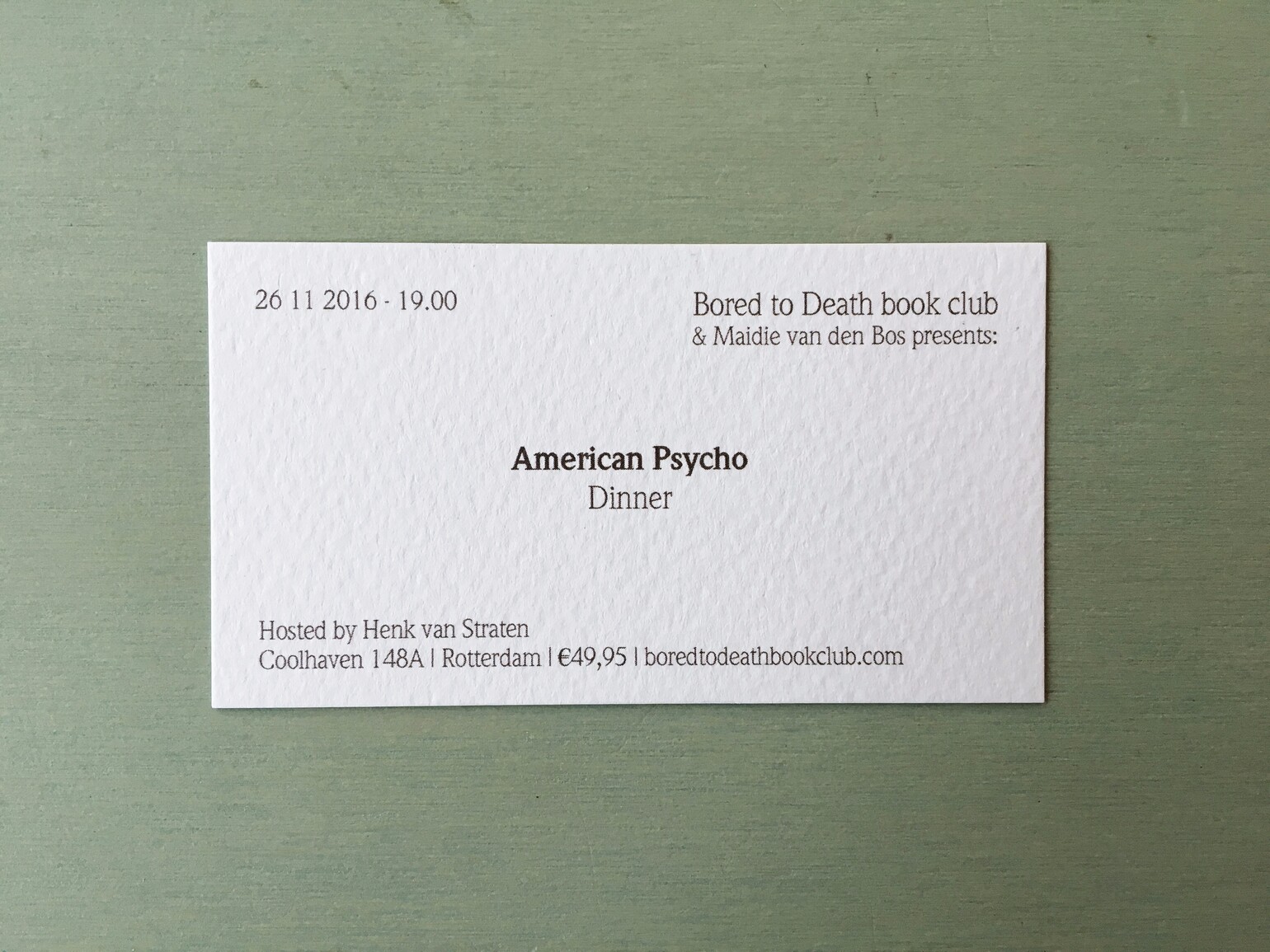 Als groot fans van cultroman American Psycho van Bret Easton Ellis, vonden Maidie van den Bos (Flowers&Sours en Bloesembar) en Bored to Death book club het hoog tijd voor een hommage. Het resultaat is een driegangendiner met begeleidende wijnen in de stijl van New York in de 80s. Schrijver Henk van Straten praat de avond aan elkaar.