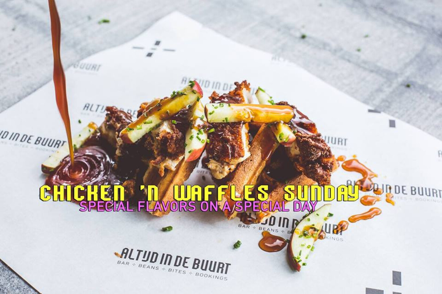Op deze zondag is Altijd in de Buurt open van 10:00 tot 18:00, sluit de keuken om 17:00 en zullen de prijzen variëren van €6,50 tot € 8,50 voor de special Chicken 'N Waffles.