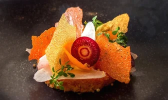 Ook een genot om te zien en te proeven blijkt de compositie van rode biet. Daarin dansen drie soorten biet, een bleke, zoete ananasaardbei, snijbietreepjes in zuur plus een avocado-geitenkaascrème met elkaar op de diepdonkerbruine 'vloer' van de schotel waarop het is neergevlijd. Het kan zijn dat enkele ingrediënten niet genoemd zijn: excuus daarvoor, hoor.