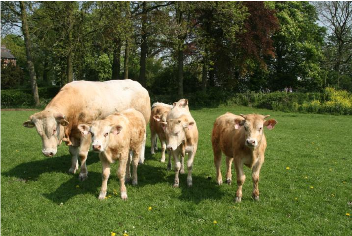 We krijgen een rondleiding op het landgoed. Te beginnen bij de eerste stal. Daar staan jonge stieren, met een dikke geel-oranje vacht en kleine hoorns. De runderen van Wouter zijn op natuurlijke wijze geboren. Daar kwam geen arts aan te pas, moederkoe deed alles zelf. Tijd voor ons hebben de jongens niet, ze zijn te druk bezig met eten. Volgens Wouter eten alle runderen in totaal achtduizend kilo per dag. Daar valt onze mond even van open. In het eerste levensjaar krijgen de runderen gras te eten, daarna eten ze een mix van kuilhooi, maïs en aardappel. De mest die de beesten produceren, wordt gecomposteerd en gebruikt voor bemesting
