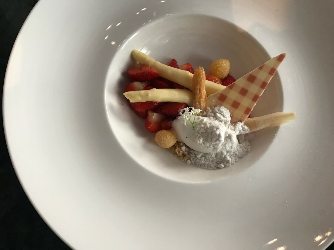 Om het verhaal rond te maken komen de drie A’s komen terug in het dessert. Dus ook die vermaarde ansjovis (die in de zomermaanden in Zeeland gevangen wordt, maar wel door een familie uit Bergen op Zoom). De combo met ansjovispoeder is gedurfd, maar het frisse zoetzuur uit de aardbeien zorgt voor een verrassende balans.
