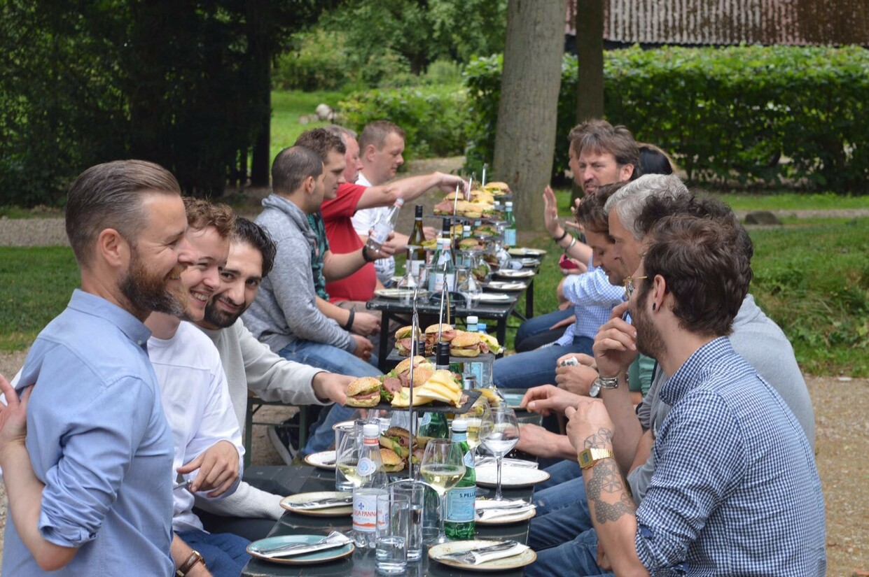 Op de weg terug naar het huis kijken we onze ogen uit. Wat een stuk land! Wouter heeft geen woord gelogen over de fijne leefomstandigheden van zijn dieren. Onderhand begint onze maag wel te knorren door de vele verhalen over het vlees. Gelukkig staat er een lunch op ons te wachten bij terugkomst. Van der Burg en Bol heeft de mannen van restaurant Ferro opgetrommeld om een feestmaal voor ons te bereiden: broodjes ossenworst, pastrami, een longhaasje, een bavette met truffeljus, een hamburgertje en tot slot een entrecote, allemaal van Palmesteyn. Het ene smaakt nog lekkerder dan het andere. Het vlees is mals, sappig en vol van smaak. Boer Wouter heeft wederom gelijk: een beetje peper en zout in de hamburger is meer dan voldoende. Een tweede portie is dan ook moeilijk te weerstaan.