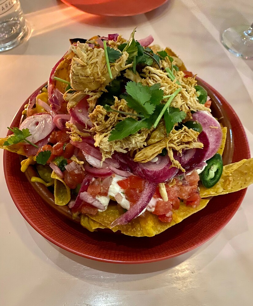 Op de kaart van Casa Chow staat een grote verscheidenheid aan gerechtjes uit de USA, Latijns-Amerika en Azië. Ons gezelschap bestaat uit twee, dus helaas hebben we maar een klein gedeelte van alle gerechten kunnen proberen. We trappen af met de nachos, dat bestaat uit een enorme berg crunchy nachochips, kruidige pulled chicken, zoetzure ui, jalapeños, een beetje koriander en natuurlijk kaas. Misschien niet de beste keuze met een kaart waar zoveel te kiezen op staat, hierna zijn we namelijk al aardig verzadigd. Na een korte pauze krijgen we een reeks van verschillende gerechtjes op tafel. Een kleine beef slider met cheddar en bacon, de ‘deepfried Donald’ pekingeend flensjes met hoisinsaus en de vegetarische springrolls met groenten, crunchy macadamia mix en avocado.