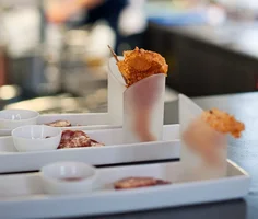 Als we aankomen bij DeliCees, bellen we aan en doet Ester de deur open. Het pand oogt statig, maar is binnen modern en met zorg en smaak ingericht. Ester vertelt dat het restaurant verdeeld is in drie verschillende ruimtes: een ruimte bij de keuken, bij de openhaard en de bibliotheek die ook gebruikt voor private dining. We krijgen een tafeltje in de keukenruimte aan het raam met het uitzicht op de mooie historische binnenstad van Dordrecht.