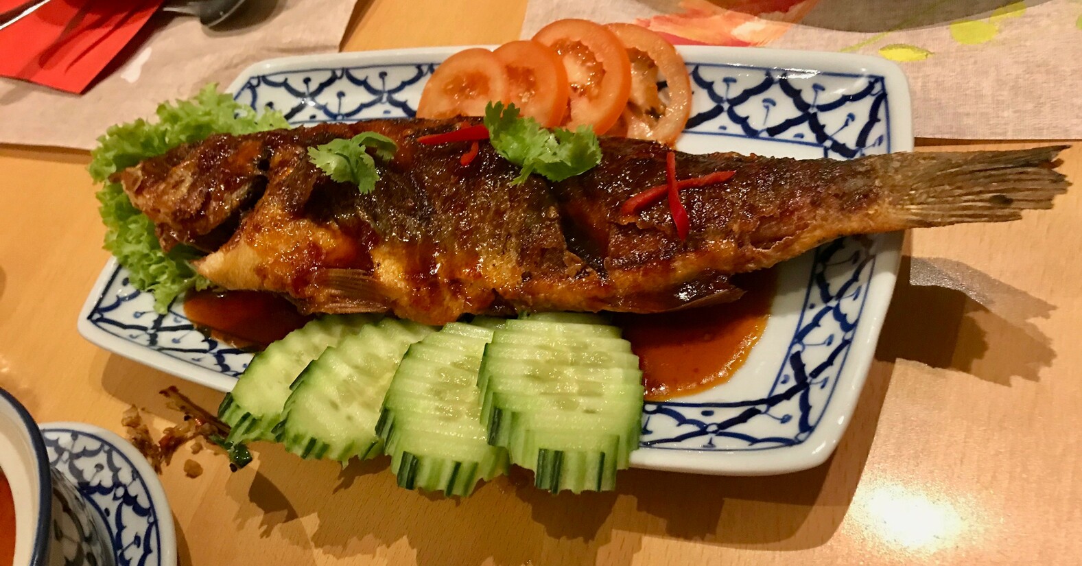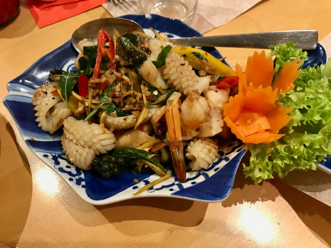 De tom yam (heldere, pittige champignonsoep) geeft ons wat rust voordat onze tafel volgestouwd wordt met de hoofdgerechten. Naast de klassieke pad thai en de roergebakken Thaise broccoli met krokant spek zijn dit een salade van inktvis en garnaal en een hele zeebaars gebakken in olie. De laatste twee bekoren ons het meest. Vooral de zeebaars verrast; zo aten we deze vis nog niet eerder. Khom wil niet te veel verklappen, maar ze heeft de baars met een kruidensaus gemarineerd en vervolgens in de olie gebakken in de wok (niet gefrituurd, zegt ze zelf, maar dat lijkt een semantische discussie). Voor deze zeebaars zouden we zo weer naar Nieuwerkerk afreizen.