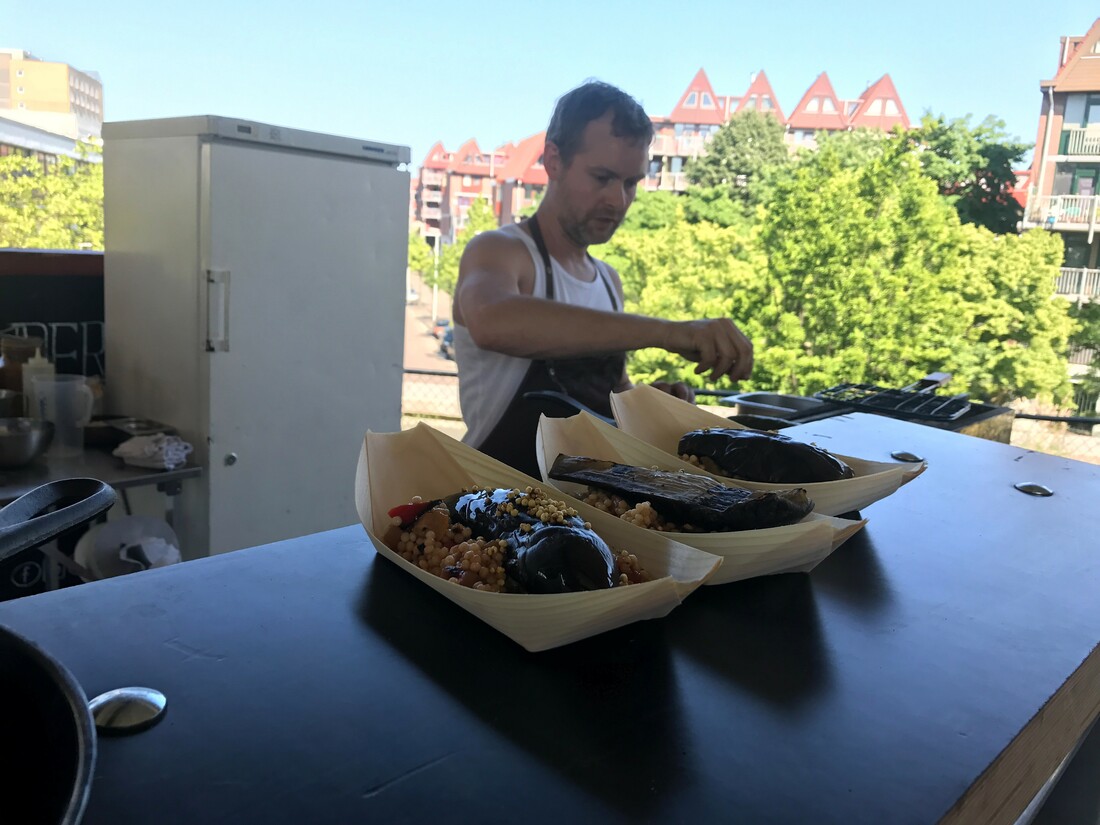 Naast al die wijn moet er natuurlijk ook iets gegeten worden. En spijs is een belangrijk onderdeel van het festival. Pepijn Schmeink van restaurant Dertien staat er achter een barbecue en serveert ons gegrilde aubergine met een mediterrane couscous en een crème van koriander. Naast Dertien vinden we DJ Wooldrik met zijn Tandoor 104, Restaurant Chung samen met Marnix Benschop, Westerkaartje, Vermeyden Delicatessen en Lekker Wijnig, dat ons hele verfrissende champagneijsjes serveert.