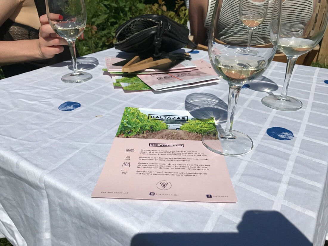 Na de wijncocktail lopen we door naar Baltazar, van Bas en Joost. Zij vertellen hoe zij de maaltijdbox-trend hebben weten toe te passen op wijn. Baltazar bezorgt namelijk elke maand een box met drie speciale flessen wijn voor €33,00. Deze wijnen zijn alle afkomstig van kleine onontdekte wijnboeren - en boerinnen. “We zijn van plan om een box te maken met alleen maar wijnen die gemaakt zijn door boerinnen,” vertelt het duo. Bij Baltazar proeven we een frisse muscadet uit de Loire en heerlijke houtgelagerde weissburgunder uit Duitsland.