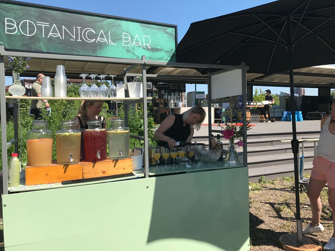De rondleiding begint met een glas crémant uit de Elzas van Vins d'Alsace. Na dit aperitief krijgen we een introductie van De Wijnwijven, een van de medeorganisatoren van RYPP, met daarbij een glas chenin blanc uit Zuid-Afrika. Daarna lopen we door naar de Botanical Bar. Hier vinden we Maidie van den Bos van Bloesembar en Flowers & Sours. Met haar zelfgemaakte siroopjes maakt ze een frisse wijncocktail met sinaasappel en een rode tempranillo ,die het uitstekend doet bij deze temperaturen.
