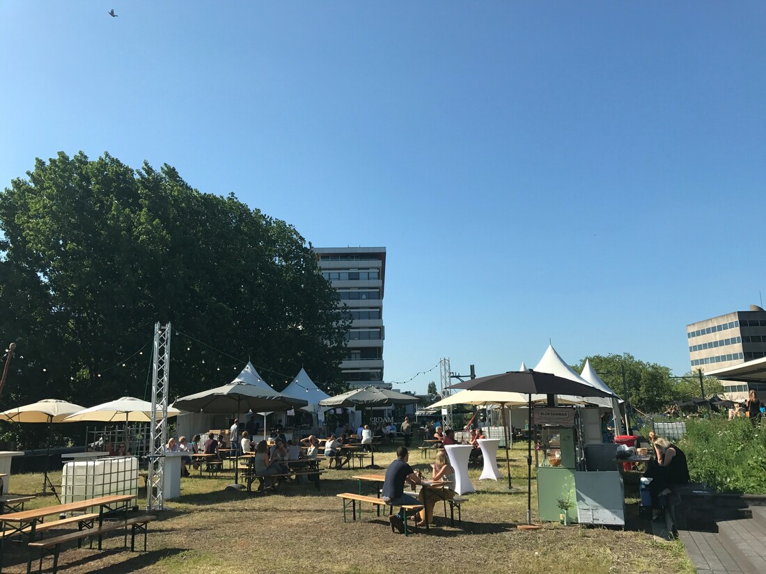 Het is een locatie die we eigenlijk niet genoeg voorbij zien komen, het dak van de Hofbogen. Wanneer je bij Opporto om de hoek de trap op loopt bevind je je opeens midden in een groene oase tussen alle gebouwen van de stad. Dit weekend staat dit dak helemaal in het teken van wijn en spijs tijdens het allereerste RYPP festival. Flink ingesmeerd gingen wij het zonnige dakterras op voor een rondleiding over het terrein.