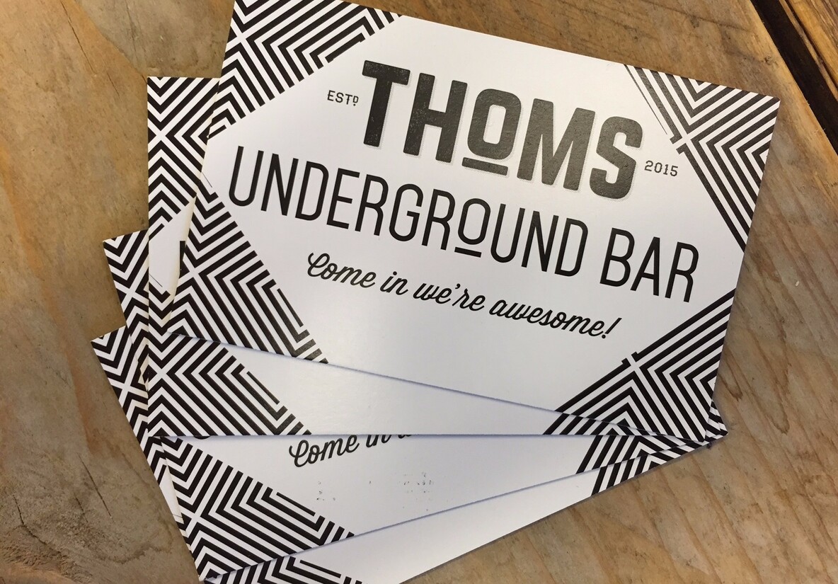 Verstopt in het hart van de zaak, slechts twee brede trappen naar beneden, vinden we THOMS Underground Bar. Rond tien uur ’s avonds maakt de keuken (die zich ook in de kelder bevindt) zich op voor sluitingstijd, worden de lichten gedimd en zet de DJ de eerste songs in. De L-vormige, houten bar is het middelpunt van de kelder en is prettig om aan te hangen. Er is gelukkig gedacht aan doorloop en dus is er genoeg ruimte om heen en weer te lopen. Het lage plafond en industriële, wat ruiger interieur zorgt toch voor een gezellige en intieme sfeer. Artiesten als Venour en DJ Laurenzo draaien op deze plek iedere vrijdag en zaterdag van tien tot twee een mix van funk, HipHop en R&B. In de Underground ben je haast gedwongen met elkaar te praten of dansen, er is in de kelder namelijk nul ontvangst. Ook wel ‘ns goed voor alle telefoonverslaafden onder ons!