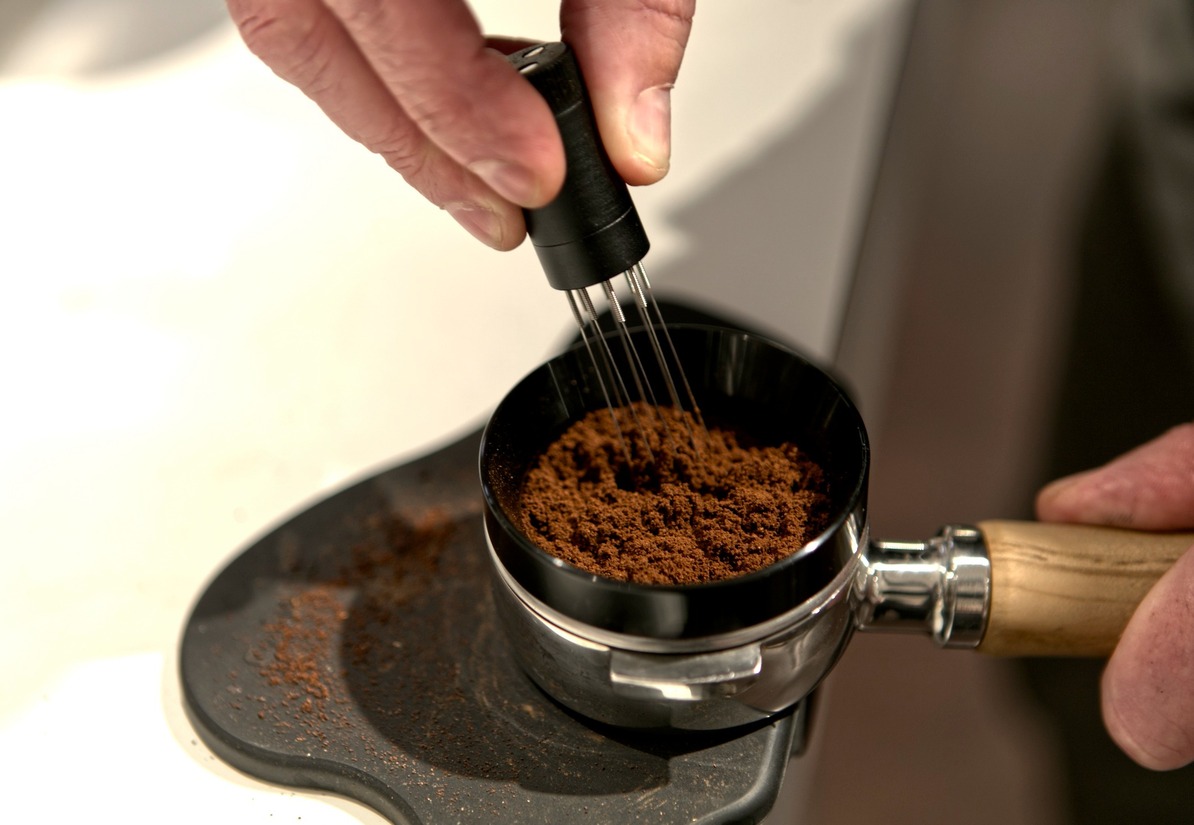 Zowel de koffiefreaks als zij voor wie zelf koffie maken nog onontgonnen gebied is, krijgt hij over de vloer. “Dat maakt mijn werk zo tof. De ene keer ben ik bezig met profs of thuisbarista’s die een totale controle willen op hun shot of hun kennis willen botvieren op een machine. Met hen ben ik in de weer met puckscreenplaatjes, tampers, bijvoorbeeld die van Pullman, en WDT-tools -die distributietools met naaldjes- voor een maximale tegendruk, een zo gelijkmatig mogelijke verdeling en het verwijderen van statische energie uit de gemalen koffie. Bij de volgende klant ben ik het verschil aan het uitleggen tussen een volautomaat en een halfautomaat. Bij elke klant stel ik me hetzelfde doel: hoe vervul ik jouw koffiedroom?”