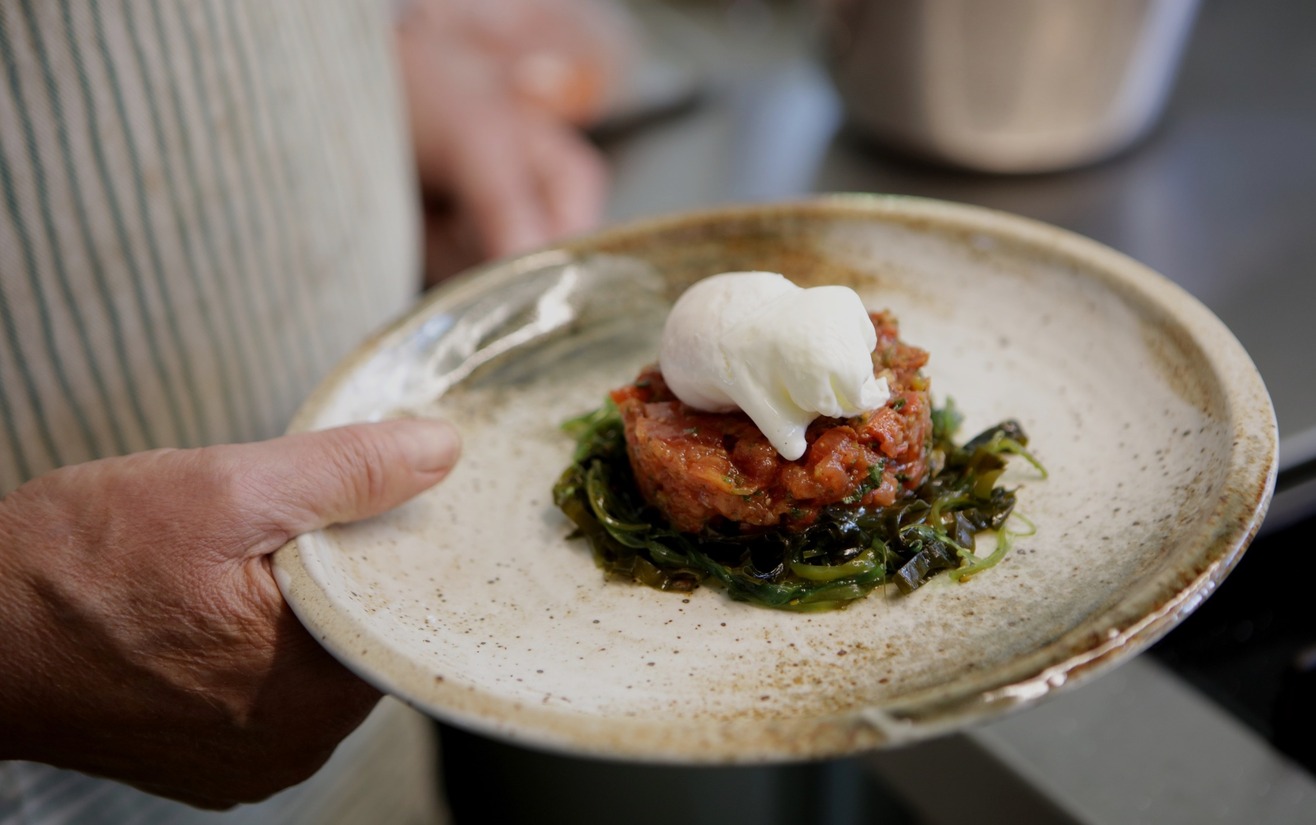 Ria Schipper wordt vandaag bijgestaan door Els van Eyken, de stylist van het Kookpunt. Terwijl Els de tafel vakkundig dekt met serviesgoed van Tokyo Design Studio, HK living en Zen, serviesgoed dat niet misstaat in een restaurant, trekt Ria de vintage cornichonpot op het keukenblad open. De mini-augurkjes gaan met een sjalot, zeekraal en peterselie in de tartaar van gepliceerde tomaten.