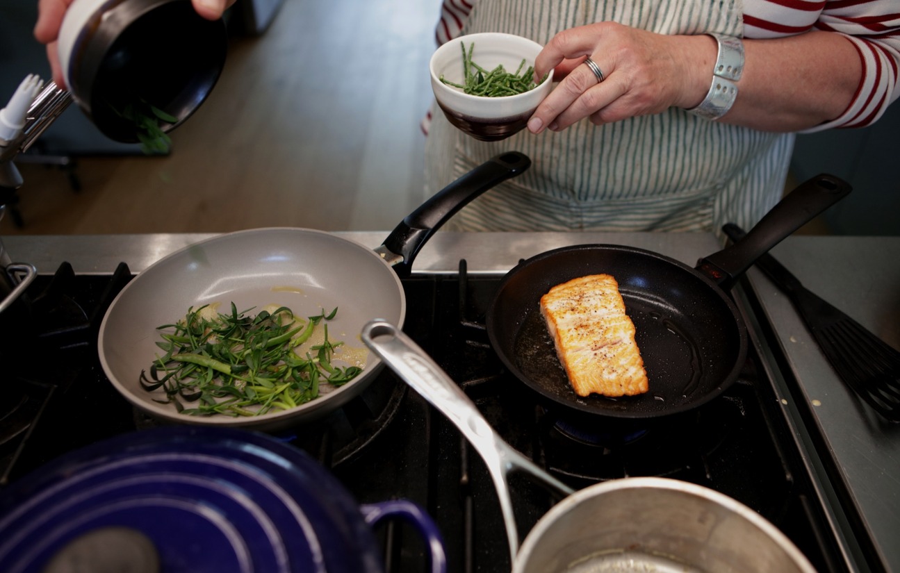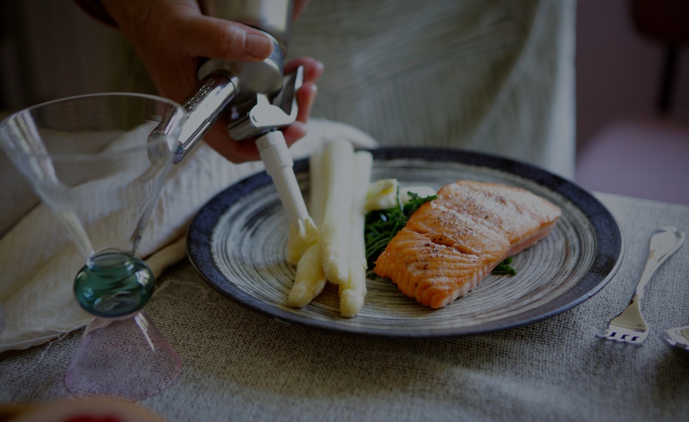 Aperges, ook wel het witte goud genoemd, zijn momenteel volop verkrijgbaar. Dan laat je dat nu natuurlijk niet liggen als je thuis aan de slag wilt als een prof. Thuiskookexpert Ria Schipper gaat voor de klassieke versie met zalm (in de tuin) gegrild op de Big Green Egg, drie soorten roergebakken zeegroenten (zeekraal, zeebanaan en zeevenkel) en een hollandaisesaus op basis van dragonazijn. Maar dan wel een hollandaisesaus à la een chef, dus uit de kidde van in dit geval Mastrad. “In de kidde wordt de saus luchtiger, schuimeriger. Zet de kidde alleen niet in een pan met kokend water, houd hem warm op 70 graden.”