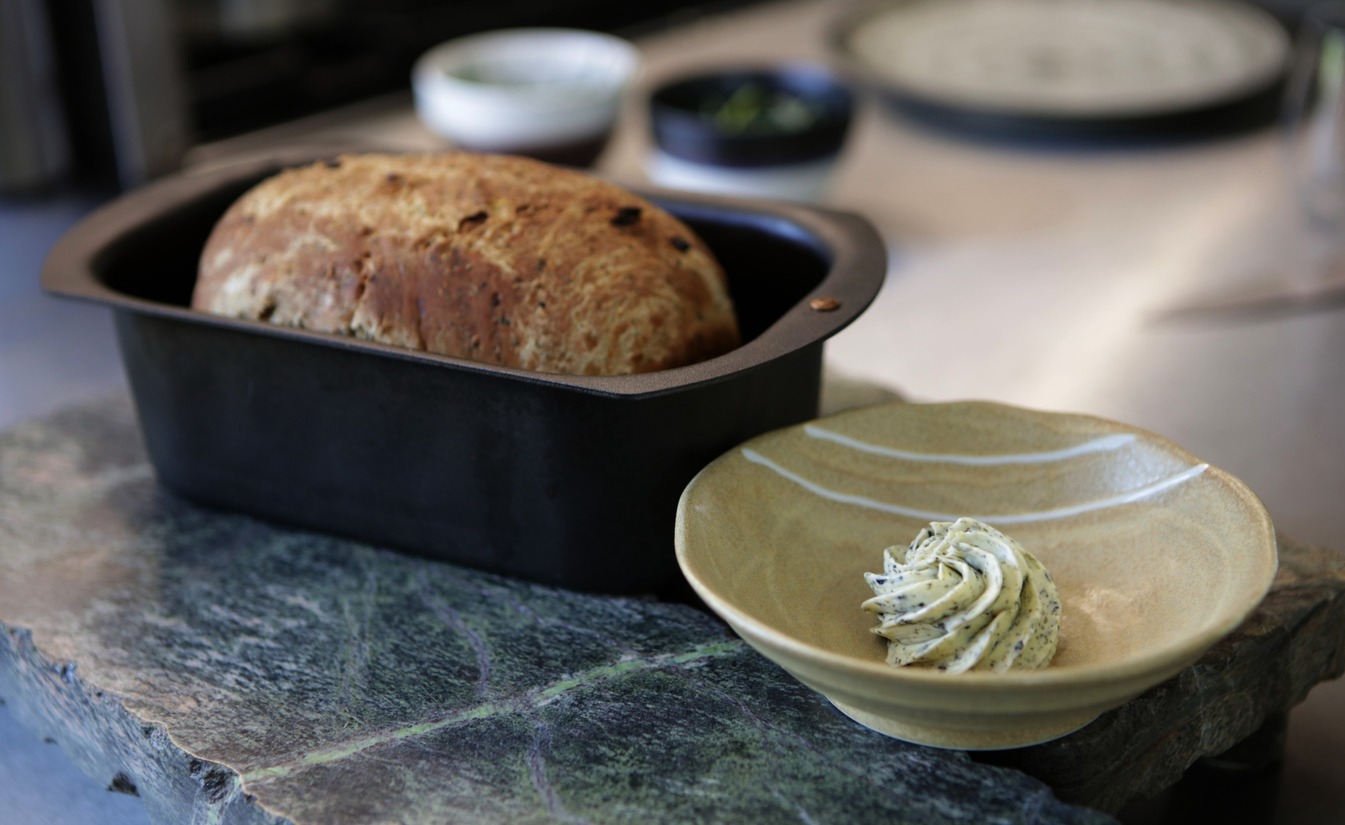 Koken is dus vooruitdenken. Om die reden heeft ze gisteravond al een Italiaans kruidenbrood in een met gesponnen ijzer gesmeden tray gebakken in de Big Green Egg. “Het is een broodmix van molen De Speelman in Overschie. Zwarte olijf zit erin, en zongedroogde tomaatjes, echt heerlijk, mede door de licht rokerige tonen door de houtskool in de kamado.” De zeewierboter als smeersel heeft ze gemaakt van ongezouten boerenboter, nori en een scheutje Vietnamese plantaardige ‘vissaus’ van Phans. “De vegan vissaus is gemaakt van zeewier, de andere van steenbolk. Er zijn vast chefs die nuoc mam maken, maar met Phans, verkrijgbaar bij het Kookpunt, kun je jezelf die tijd besparen.”