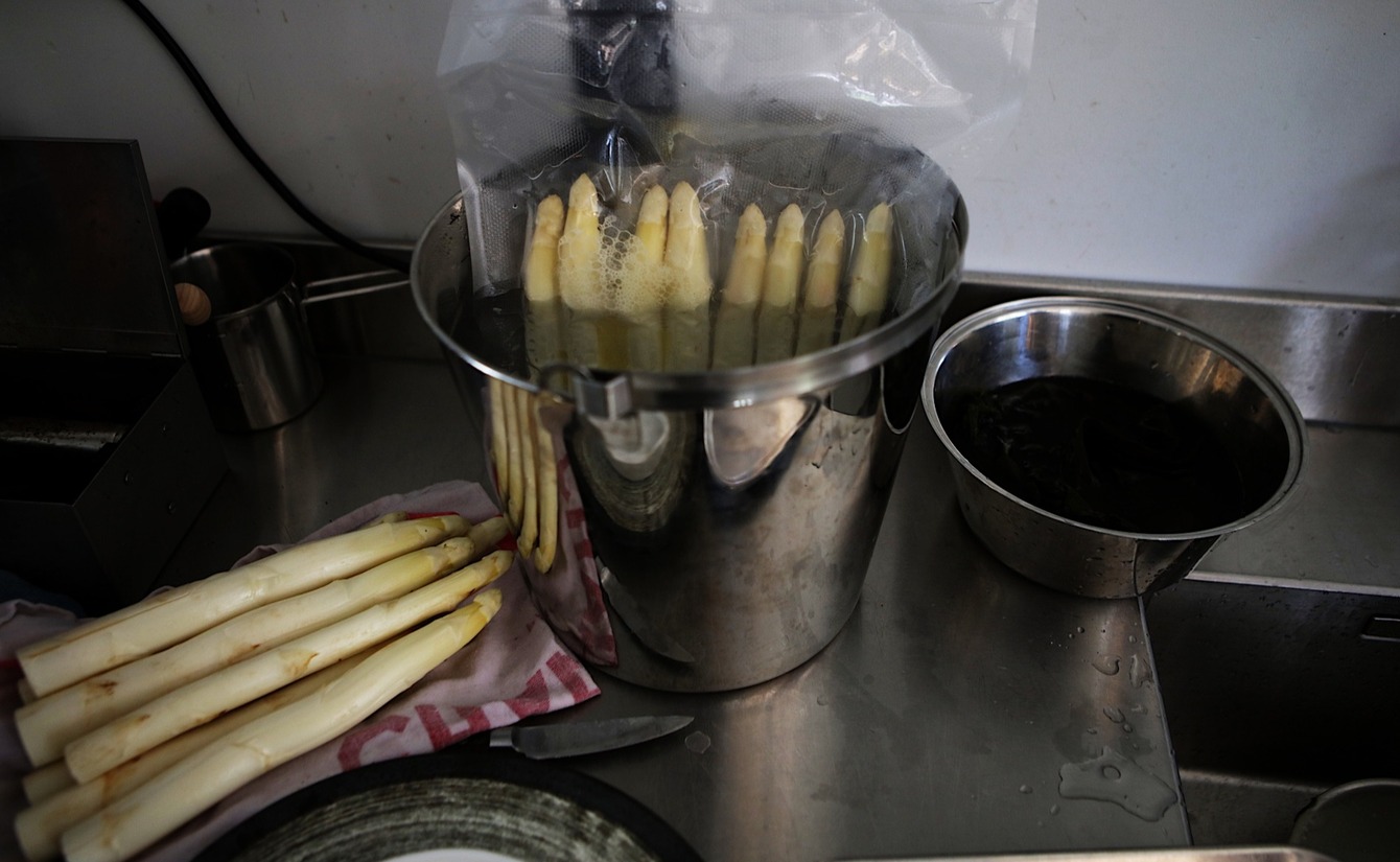 Een chef kookt doorgaans alleen asperges als die van het kookvocht een saus of crème wilt maken. Als asperges op het menu staan, worden de stengels vrijwel altijd sous-vide gegaard. “Als je asperges kookt, trek je nogal wat smaak uit deze groenten. Door asperges sous-vide te garen voorkom je dat de smaak deels belandt in het kookvocht. Anders gezegd: je hebt een veel geconcentreerdere smaak in je asperges. Lange tijd was in restaurants de trend om asperges te konfijten in olie. Dan behoud je eveneens de smaak maar sous-vide garen is een gezondere techniek.”