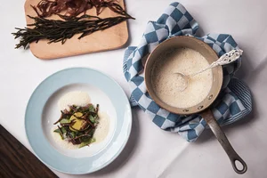 Gebakken paddenstoelen en gefermenteerde zwarte knoflook worden tot een zachte pasta gedraaid. Schook gebruikt zwarte knoflook omdat die milder smaakt en een beetje zoetig is. Die zwarte knoflook heeft 30 tot 40 dagen in een vochtige ruimte gelegen, waardoor fermentatie is opgetreden. Fermentatie is een eeuwenoude techniek waarbij micro-organismen, zoals bacteriën, schimmels en gisten, worden gebruikt om een product te laten veranderen. Vaak wordt de smaak intenser en meestal iets zuurder.