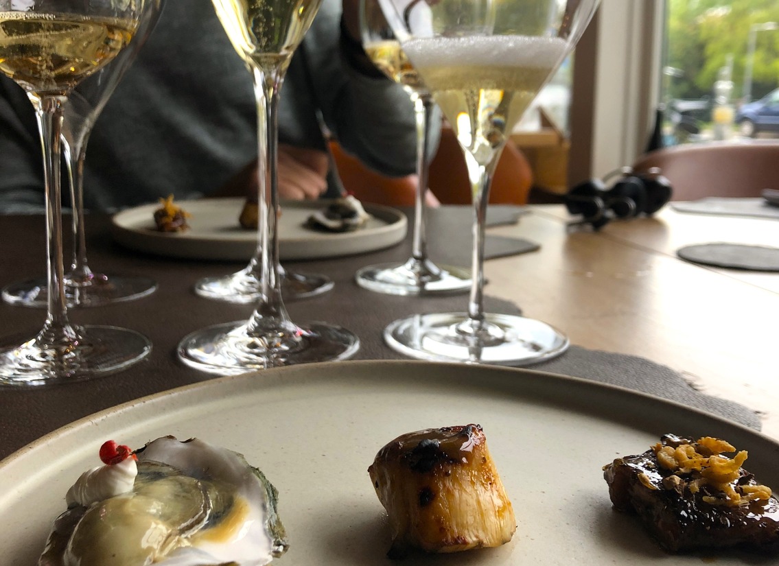 Vanuit de keuken knikt een grijnzende Floris bevestigend onze kant op. Best knap iedere keer weer van die fraaie champagnes bij de gerechtjes zoeken. "We draaien het spelletje vaak om. Dan kijken we welke champagnes er op dronk zijn of waarmee we willen werken. Op dat moment begint de machine bij Floris te draaien en bedenkt hij wat erbij kan qua eten." Hun champagnes selecteren ze zelf en importeren ze eigenhandig. Je drinkt er dus wijnen die je niet snel ergens anders vindt en ze zijn zonder uitzondering afkomstig van kleine, duurzaam werkende wijnmakers. Dus veel biologisch en zelfs biodynamisch. Kleine nuance: bij ‘alleen champagne’ gaat het om de wijnregio in Frankrijk, niet alleen de beroemde mousserende wijn. Want wist je dat er daar ook stille witte en rode wijn wordt gemaakt? Of Ratafia de Champagne, een zoete, gerijpte drank die vooral bij desserts op tafel komt?