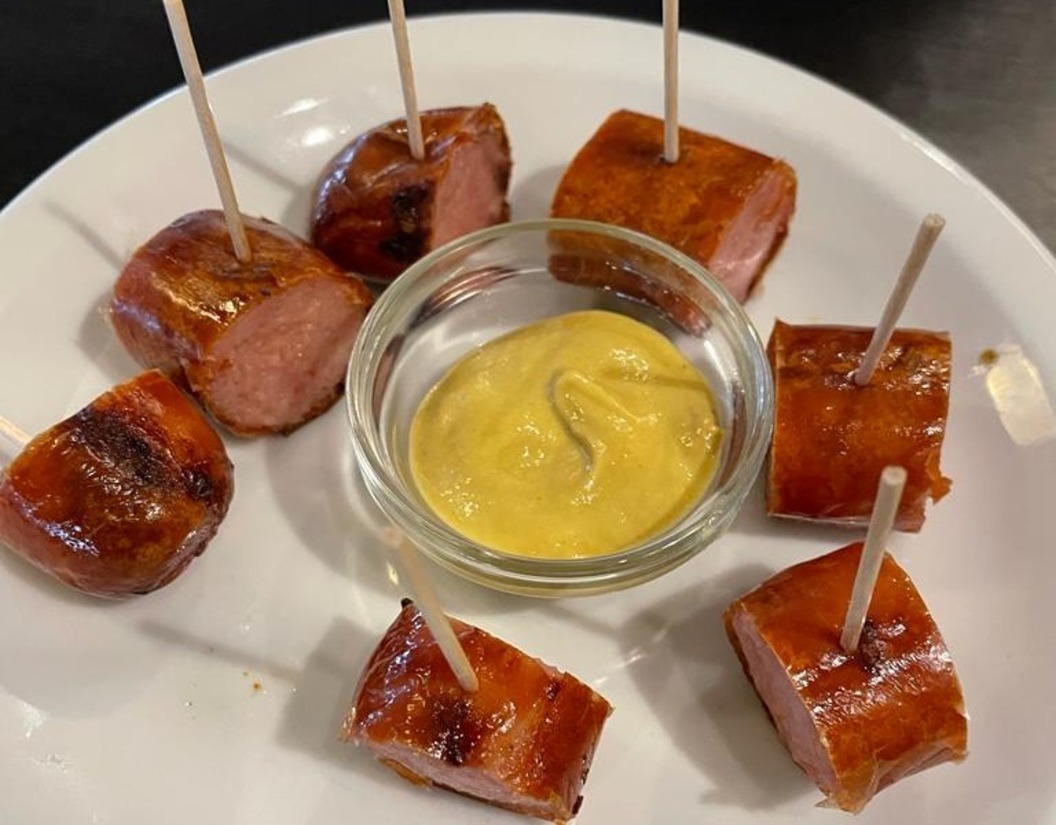 Foto: zijn rookworst kan als borrelhap gegeten worden, maar met een broodje ook als hotdog en van de BBQ als braadworst