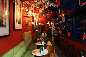 "We wilden niet al te serieus zijn hier, dat werkt niet op zo’n klein oppervlak", vertelt Miquel. "Als uitgangspunt hebben we een bekend horecaetablissement in New York gebruikt. Maar het is puur als inspiratie, we wilden het concept niet kopiëren. Eerst hebben we de muren en het plafond rood geschilderd. Het plafond is wat hoger dus daar wilden we ook wel wat aan ophangen." Patrick: "Die Chinese lampionnen had ik al een keer gezien op de West-Kruiskade, dus die kwamen er sowieso in. Toen hebben we 's Zomers Bloemen ingeschakeld en samen met hen de rest volgehangen." Rode ballen, roze bloemen en barbiepoppen aan het plafond en de enorme blauwe, houten kast aan de muur tegenover de groene bank: er is genoeg te zien. Miquel: "Dat was ook de bedoeling. Als het een standaardinrichting zou zijn in zo’n kleine ruimte ben je snel uitgekeken. Nu is het een soort kijkdoos."