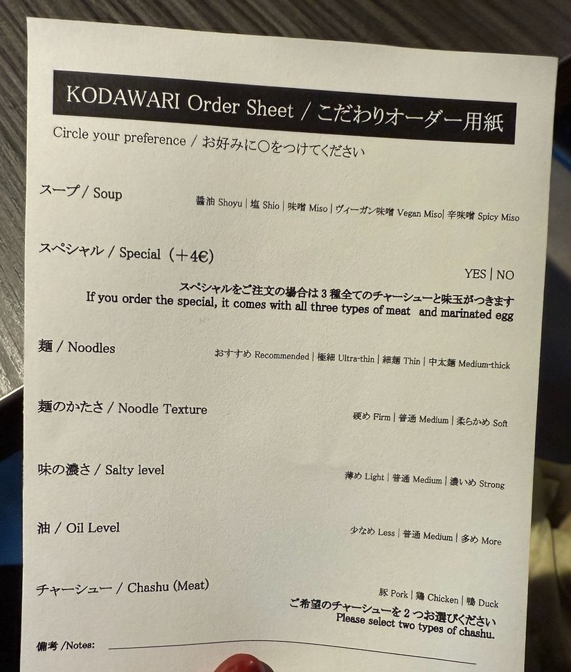 Dan is het tijd om zelf ramen uit te kiezen. De menukaart is overzichtelijk en komt met een papieren velletje, waarop je zelf je kom ramen samenstelt. Wil je dikke of dunne noedels, welke bouillon wil je en wat wil je erin? Dat papiertje geef je vervolgens mee met de bediening en dan gaat de keuken ermee aan de slag. Geen groot menu met honderden keuzes, maar gewoon even afstrepen.