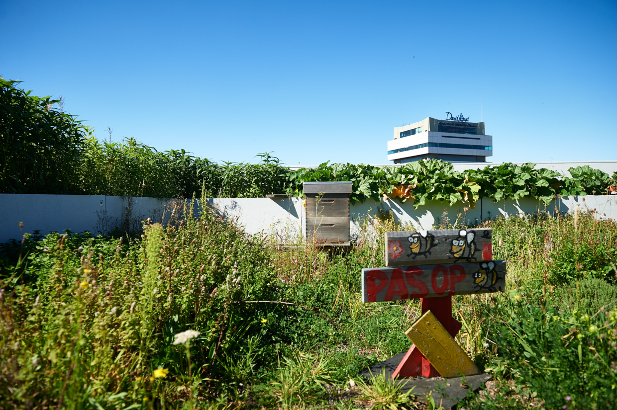 De dakakker is overgewaaid uit New York. Wouter: ‘Vooral in Brooklyn zijn er veel rooftop farms. Toen we met het Rotterdams Milieucentrum naar het Schieblock verhuisden, wilden we meteen iets doen met dat lege, grijze dak.’ De buren van architectenbureau ZUS liepen met eenzelfde idee rond. Ze dienden hun idee voor een luchtsingel in, wonnen het Stadsinitiatief van 2011 en begonnen met de bouw. In drie weken tijd werd de akker aangelegd. En inmiddels is aan de andere kant van de luchtsingel een dakgaard geopend. Daar staan 130 fruitbomen. Binnenkort wordt de eerste oogst geplukt. Het is nog spannend wat dat gaat opbrengen, maar er gaan al geruchten over een oogstfeest in de nazomer van 2017…