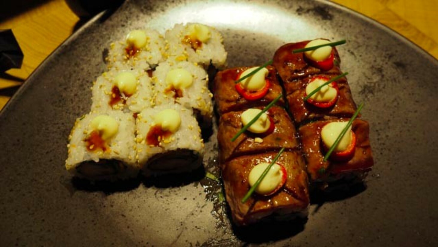 Er staat een aantal signature rolls op de kaart, bedacht door sterrenchef Kei Kobayashi. Hij creëerde vier exclusieve recepten in een mix van Japanse invloeden en de Franse gastronomie. Ik mocht een van deze rolls uitproberen, de Gyu Special roll. Deze bestaat uit rundvlees, avocado, wortels, rode paprika, rucola, koriander, bieslook, gebakken uien, piment, mayonaise, sesamolie, teriyakisaus en limoen. Een hele mond vol, maar ik moet zeggen dat deze signature roll de missie eer aan doet: het is écht een smaaksensatie. De groentes binnenin de roll geven 'm een knapperige bite, terwijl het rundvlees bovenop juist erg zacht is. De smaak en textuur vullen elkaar perfect aan.
