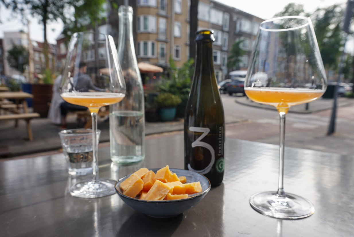 Ondanks de verhuizing weten Schiedammers de bar nog steeds goed te vinden dankzij het specifieke aanbod. Zo ook het gezelschap bierliefhebbers naast ons op het terras. Ze laten ons weten dat zij graag bij RAISIN the bar komen om uiteenlopende bierstijlen te proeven. Op tafel hebben zij inmiddels een drietal lege flessen van geuzestekerij 3 Fonteinen verorberd.