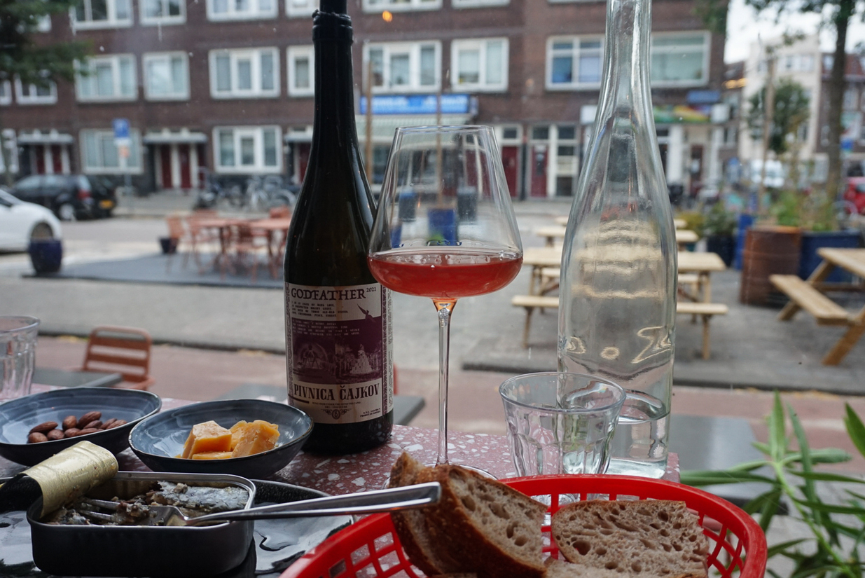 Onze buren op het terras delen hierna enthousiast een aardedonker bier met ons. Het ruikt sterk en smaakt naar een koffiesnoepje. Een opbouwende volgorde van de wijnen is hierdoor wat lastig geworden, maar Patrick weet hier een goed antwoord op te geven. Hij schenkt ons 'It’s alive' in, een Tsjechische pet-nat waarmee we door het fris-fruitige smaakprofiel een perfecte doorstart kunnen maken naar de oranje-rode Slowaakse wijn The Godfather.