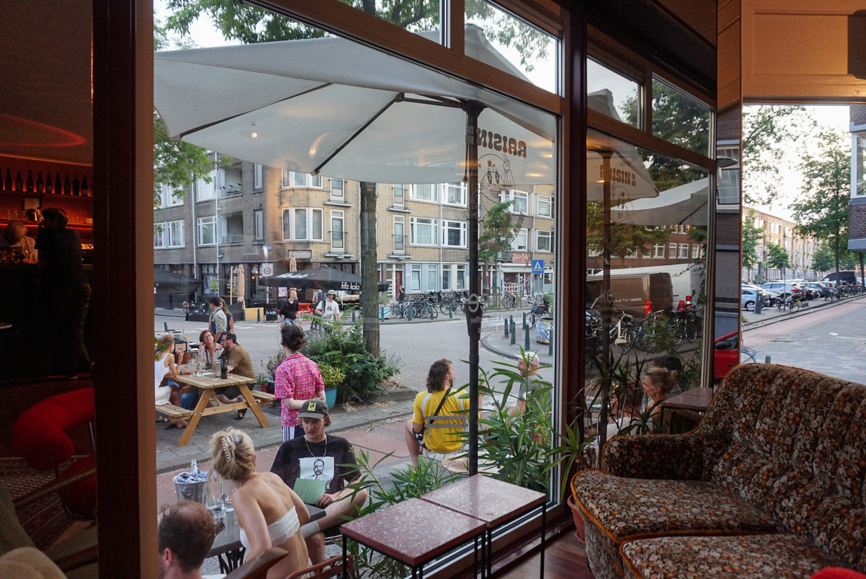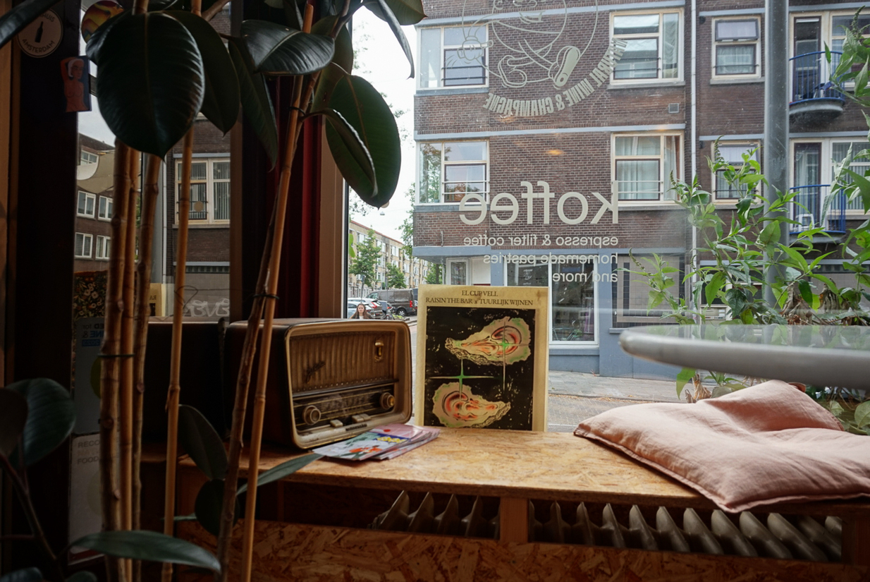 De Telefunken radio in de vensterbank, een fluor roze mannequin en de bont gebloemde bank achter het raam brengen herinneringen naar boven die ik heb overgehouden aan het bezoeken van Oost-Europese bars in steden als Warschau, Boedapest en Ljubljana. De muur is bekleed met een kleurrijk mozaïek van ingelijste prints. Dat expressie een belangrijke rol speelt bij RAISIN the bar moge duidelijk zijn.