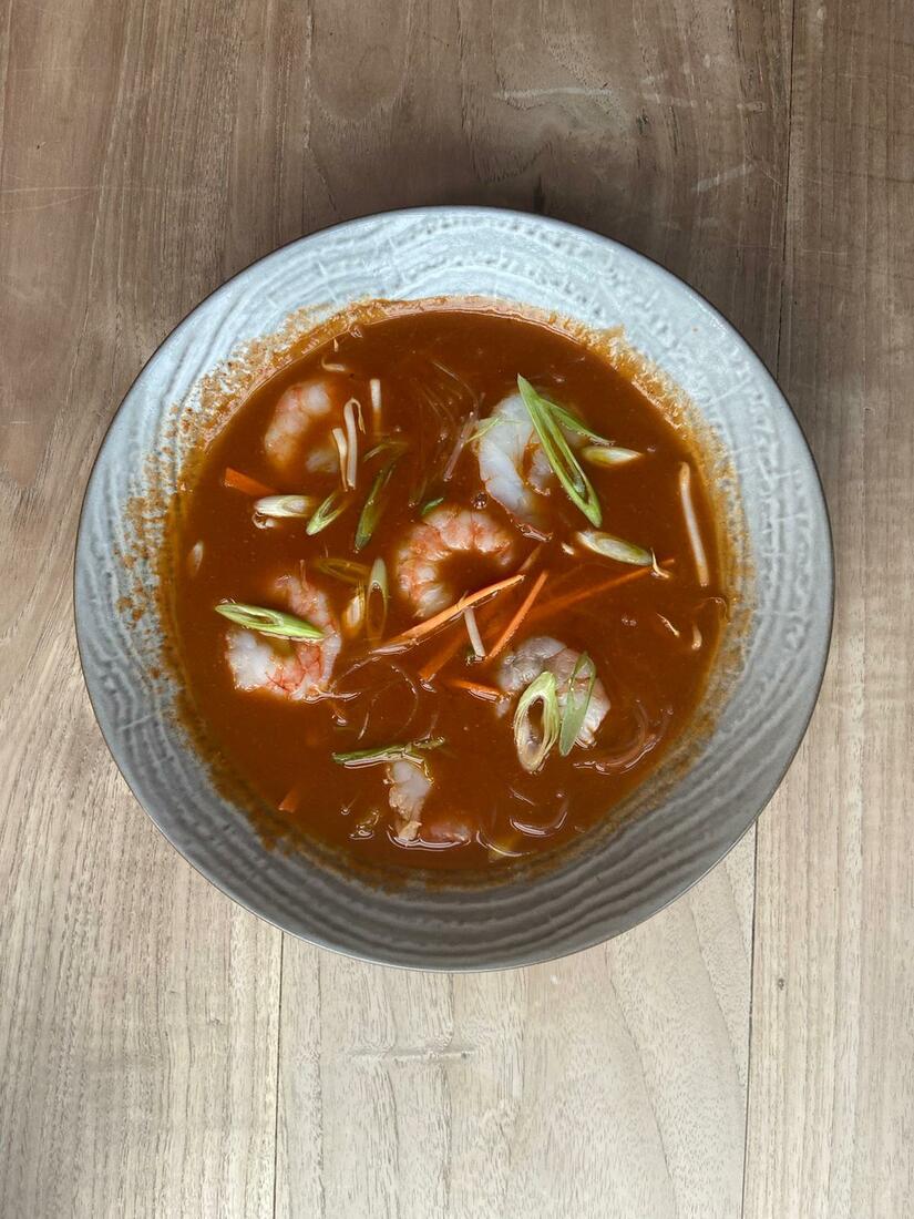 5. Voor de garnering: Kook de rijstnoedels volgens instructie op de verpakking en bak de gamba’s in een koekenpan en snijd intussen de bosui fijn. Pak de soepkommen en vul deze met de rijstnoedels, gamba’s, wortel en taugé. Giet de soep erin en garneer met de bosui. Aan tafel!