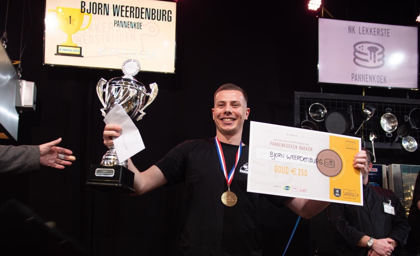 Björn voelt zich inmiddels al goed thuis in de wereld van de Pannenkoe(k). “Ewout, de oprichter van de Pannenkoe deed al eerder mee aan de Nederlandse Kampioenschappen (tijdens de horecavakbeurs Horecava, red.). Zonder dat ik het wist, had hij me opgegeven voor dit jaar”, lacht hij. Björn, die al bijna heel zijn leven omringd is door de zoete Hollandse hap, flanste binnen een kwartier – naar de regels van de wedstrijd – een pannenkoek met gekarameliseerde peer en kaneelijs, frambozen en slagroom in elkaar.