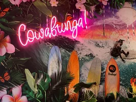 Stephen vindt het belangrijk dat Cowabunga feel good food gaat serveren. Dit houdt in dat je lekker en veel kunt eten, maar zonder je schuldig te voelen. Er wordt per gerecht rekening gehouden met de juiste hoeveelheden proteïne en koolhydraten. “Het is dus gezond, maar we gaan je wel verwennen. Het wordt hoe dan ook een feestje”, lacht Stephen vrolijk. “Dit zijn echt gerechten die populair zijn op plekken waar veel watersporten zijn. De gerechten zijn heel smaakvol en zie je veel bij bijvoorbeeld strandtentjes in tropische omgevingen. Daarom hebben wij zelf die omgeving hier ook ‘nagebouwd’. Ons interieur is heel kleurrijk en tropisch.” Cowabunga brengt ook de watersportsferen terug in de zaak. Stephen’s vrouw, die naar zijn zeggen erg creatief is, heeft een van de wanden in de zaak met kleurrijke flip-flops behangen, wat de echte surfersvibe binnenbrengt.