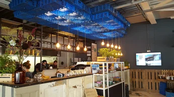 Na hard werken en veel voorbereiding was het deze week dan zo ver: Uit Je Eigen Stad opende de deuren op Centraal Station. Nog niet officieel; deze hele maand wordt er nog proefgedraaid. In september openen ze officieel. Er moeten nog wat kleine dingen gebeuren in de zaak, maar het grootste deel is al klaar. Mooie betonnen tafels en de krukjes zijn gemaakt door Buurman. Boven de bar hangt een lamp die is opgebouwd uit landbouwkratten. Ook is er genoeg ruimte om te flexwerken.
