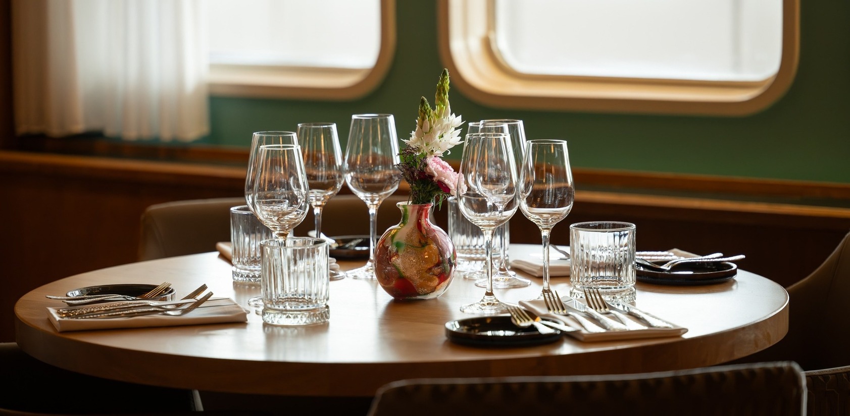 Dit elegante restaurant was vroeger de rookkamer van het schip. Je schuift aan in de jaren vijftig, maar nu niet met uitzicht op zee, maar op de Maas en de prachtige Rotterdamse skyline.