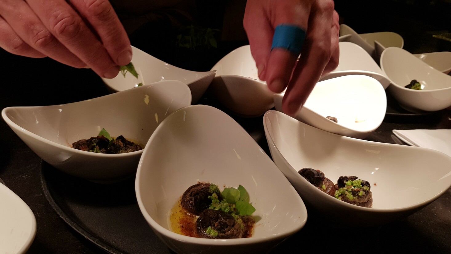 Julien oreert over het merk Reichsrat von Buhl en Mathieu Kaufman en zijn vlucht van een bekend champagnemerk naar voorgenoemd Reichsrat, waar hij zijn kennis in nieuwe producten stak en waar hij zijn droom realiseerde om de beste Sekt van Duitsland te maken. Sieberen leest een semi-erotisch gedicht voor over het orale plezier van eten en ik besef dat er een bordje voor mij staat met slakken. Ik bedoel, je kan het escargot noemen, maar het zijn nog steeds slakken. Ik zet me over mijn mentale afkeer heen en schuif de slak in één keer naar binnen. Goede smaak, wijn past er prima bij, maar het blijft een beest dat ik per ongeluk doodtrap op straat om vervolgens sorry slak te zeggen.