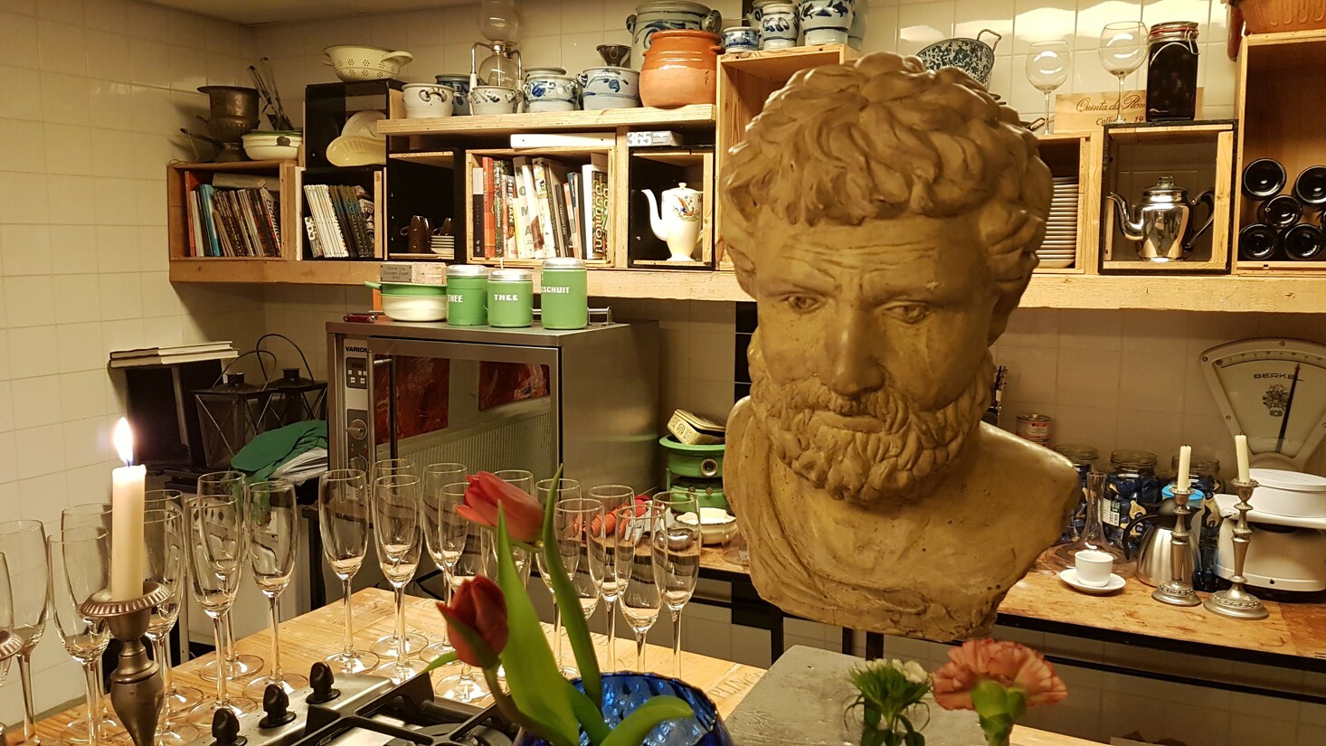 De kookstudio is een ruimte vol kunstwerken en planken vol potten, pannen en random boeken, beelden en een ratatouille van snuisterijen (haha, luxe woorden pik, yes, dank je ). Ik ben neergedaald in de speeltuin van Sieberen Meerema en Anja Koot. Anja komt over als de stille motor die de boel draaiend houdt en Sieberen is de ruwe zeeman die op woest romantische wijze zijn persoonlijkheid tastbaar maakt via het eten dat straks op de tafel zal verschijnen.